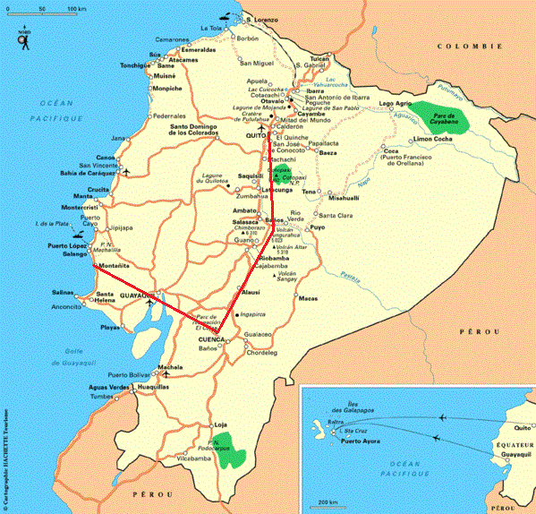 Après avoir failli louper mon avion pour Quito (cimer la sécurité pas sympathique des US ) j'arrive enfin après un jour de voyage. Je n'ai passé qu'une journée dans cette capital , mais suffisament pour avoir un très bon souvenir de cette ville. Très colorée, montagneuse, ensoleillé, bref parfait pour débuter. Quito c'est sympa surtout si tu es un fan inconditionel des églises et tous autres édifices religieux (c'est pas mon cas, une journée c'était suffisant).Et puis à Quito, tu dois t’habituer à l’altitude, nouvelle amie qui ne m’a pas lâchée jusqu'en Argentine. Elle te rappelle, que ton souffle est tout « pourri »(alors déjà que c'était pas le feu, la c'est comme si j'avais les poumons de Gainsboug) La journée m'a aussi permis de découvrir les spécialités équatoriennes. Mention spéciale pour la soupe comme entrada , même si il fait chaud ça passe parfaitement